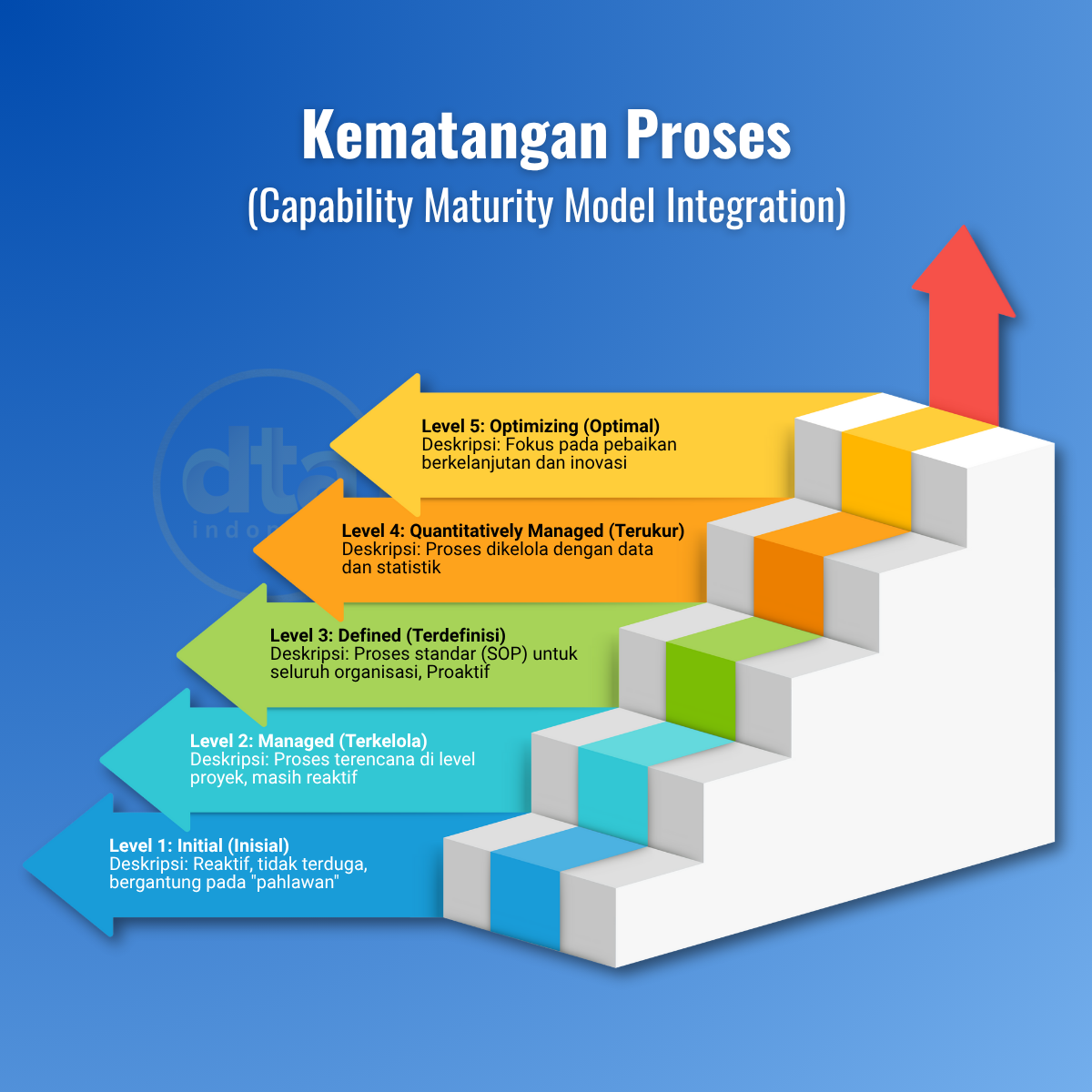 Teori ini menjawab, "Seberapa rapi cara kerja Anda?" Apakah proses Anda Kacau (Level 1, reaktif) atau Rapi (Level 3-5, proaktif & terukur)? Ini menentukan kapabilitas internal Anda.